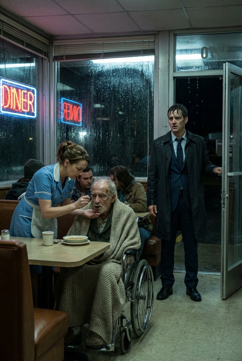 A Billionaire Stopped at a Broken Diner and Saw a Waitress Feeding a Disabled Old Man — What He Learned That Night Changed Everything He Thought He Knew About Power The rain that night did not fall gently.