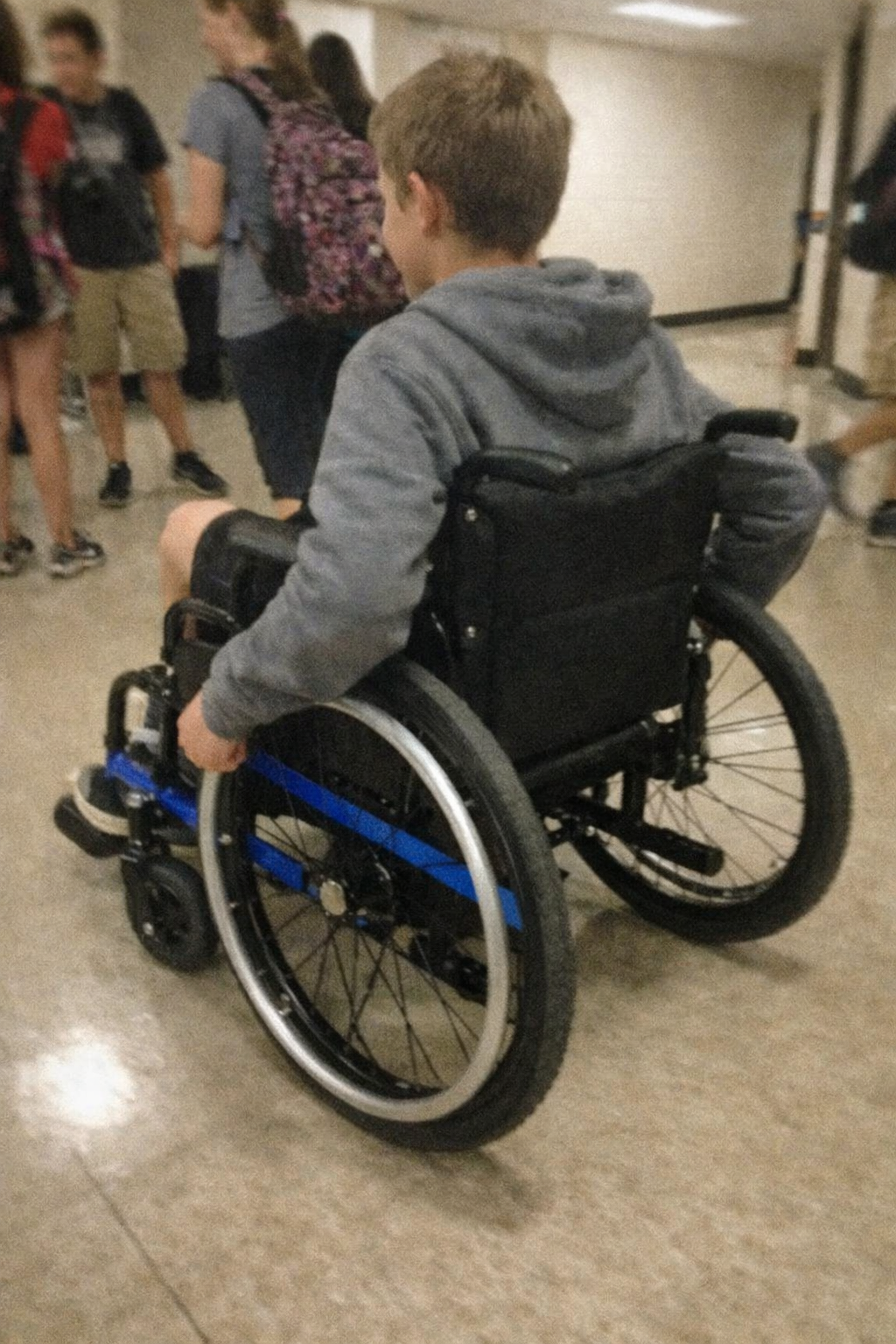 He Was Twelve, His Wheelchair Was Falling Apart, His Grandfather Used Scrap Metal and Old Tools to Keep Him Moving, Students Mocked Him Every Day, Until One Teacher Took Him Home, Worked Past Midnight Rebuilding Ethan’s Wheelchair, Added a Blue Stripe, and the Next Morning When He Rolled Smoothly Across the Classroom, The Entire School Went Silent in a Way Nobody Could Forget