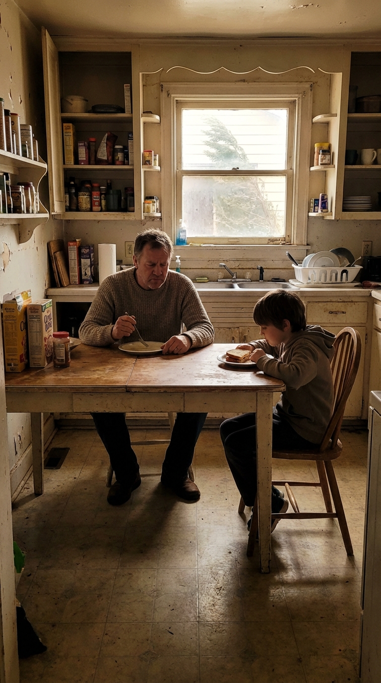 My father was visiting, and we sat around the old wooden table, the fading dinner light casting shadows on his stern face.