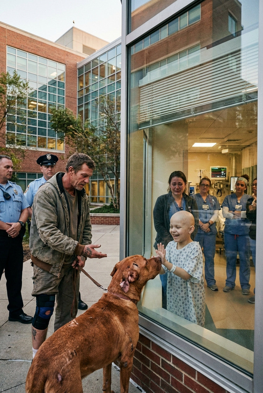 When a massive, scarred rescue dog wandered toward the pediatric cancer ward window, hospital security reacted with immediate concern. But what the frightened animal did next left nurses, parents, and doctors quietly wiping tears from their eyes.